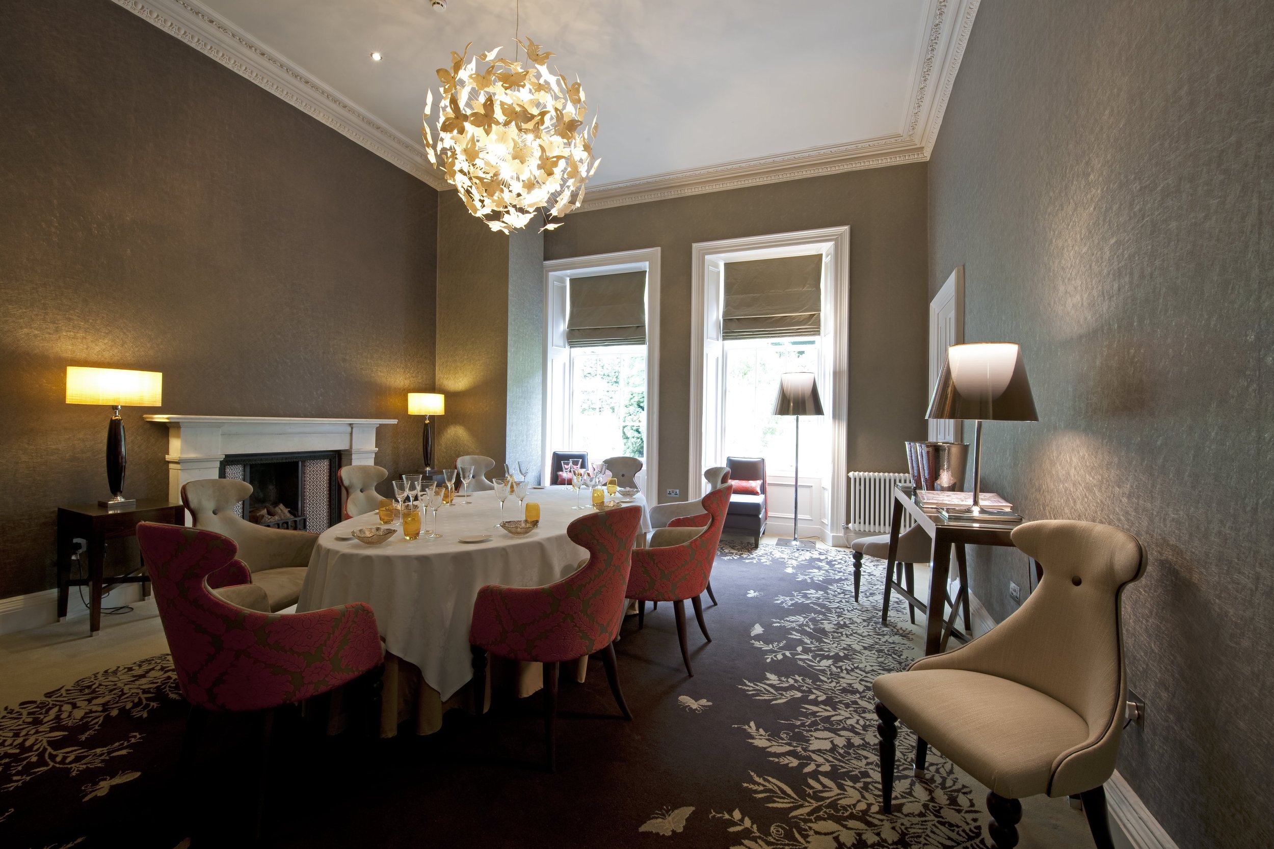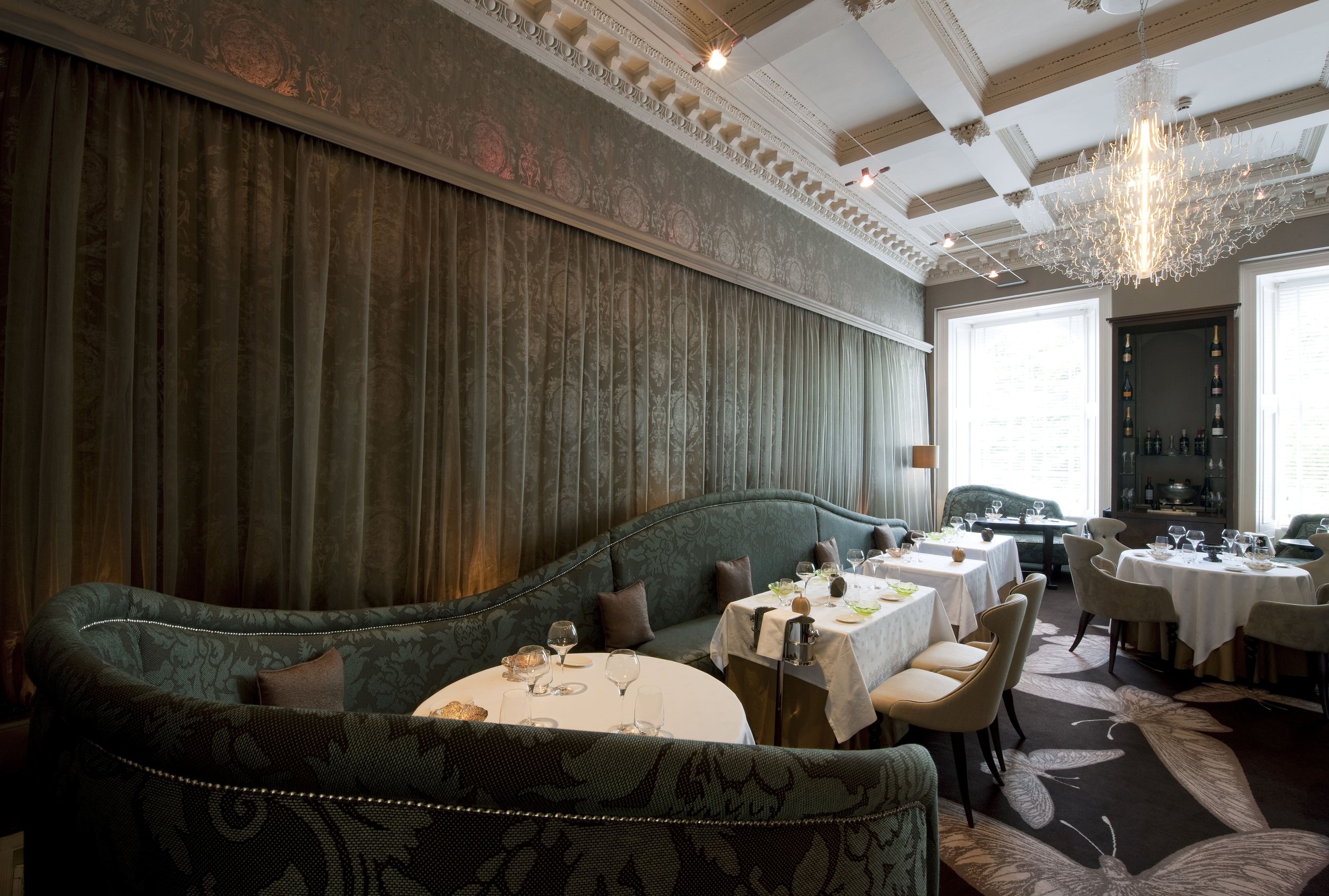 A dining experience in Scotland's capital that takes guests on an adventure from the ordinary into the unordinary through the exceptionally original menu and its palpably sumptuous surroundings. The restaurant has a relaxed glamour with a baroque style accompanied by a butterfly patterned plush carpet. Guestrooms are a mix of romantic lush fabrics layered against slatted glass screens and metallic touches.